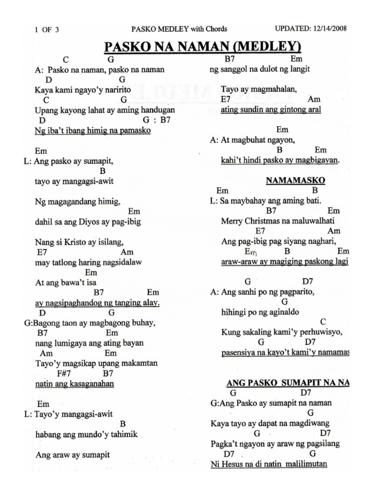 37464 views added to. 11112016 Intro G - Em x4 Verse 1 G Em Nagbunga nang lahat itong mga pagtitiis G D Sa lupang sinilangan akoy muling magbabalik C G O kay tagal din naman ng aking pagkalayo. 16122019 Pasko Na Naman Intro GmD Gm Cm D Cm DBb DA Verse Gm Pasko na naman D O kay tulin ng araw Paskong nagdaan Gm Tila ba kung kailn lang Ngayon ay Pasko G Cm Dapat pasalamatan GmD Ngayon ay Pasko D G Tayo ay mag-awitan Chorus G Pasko Pasko Pasko Pasko GB Pasko na namang muli Tanging araw G Na ating pinakamimithi G Pasko Pasko Pasko.