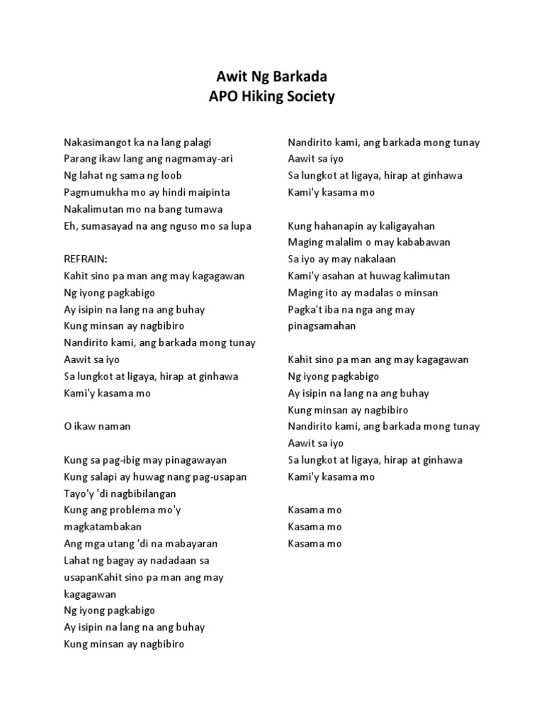 Nakasimangot ka na naman problema ay kalimutan. Awit Ng Barkada Lyrics. Sabi ko namn sayu lahat yan nag loloko Pagkatapos kang pakinabangan biglang lalayo oohhh kaya wag nang uulit pa kaya wag nang uulit pa. At kung ikaw ay nalunod na MI FAdim FAm.