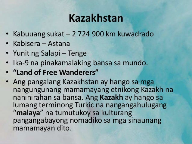 Nasa isang partido ang kapangyarihan ng pamahalaan. Ano ang mga likas na yaman sa mga bansa ng rehiyong hilagang asya. Ang Republika ng Kazakhstan ang pinakamalaki na bansang pinalilibutan ng lupain at ang ika-siyam na.