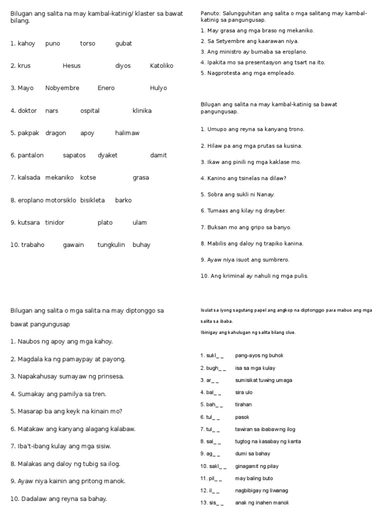 Halimbawa Ng Mga Salitang May Kambal Katinig O Klaster