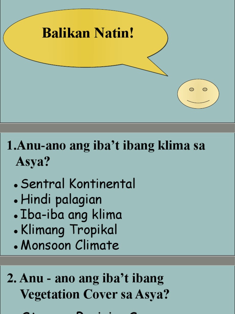 Sa bawat rehiyon ng Asya ay binubuo ng maraming mga bansa na may mga sari-sariling kultura at tradisyon. Ibigay ang limang rehiyon ng asya at ang mga bansa na kabilang sa bawat rehiyon. 09022016 Modyul 2 mga rehiyon sa asya 1.